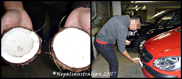 Normally animals are sacrificed during the Puja and the tools are given their fill of blood but we used a hard shelled coconut instead and let the car have the coconut water!