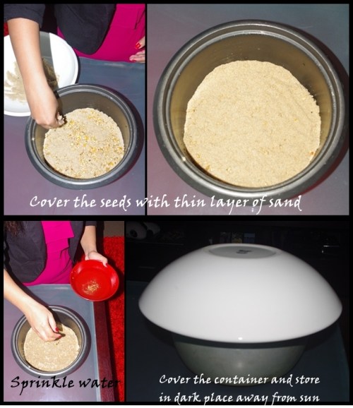 3. Sprinkle a layer of soaked Jamara mix into the container. Make sure it is only one layer of the seeds so they have enough room to sprout.
