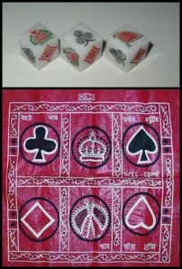One of the thing I remember about Tihar is playing Langurburja. It is a game similar to the British dice game “Crown and Anchor”. I remember taking money from dad and running to play a game with my friends. The game is played with 6 dice and a mat. The mat has similar symbols, as the dice, and they are spades, hearts, diamonds, clubs, crown and flag. The player can choose one or more symbols to bet his money on. If he gets at least one die with the same symbol which he bet on, he wins. If he gets two then he wins 2:1, the more he gets on the throw the more money he wins. As a kid we used to play for 25 paisa (equivalent to less than a cent in AUD now) a game. It was more for fun than for the money. I am sure they now play with more money than that.