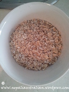 • In a bowl, mix oatmeal, almond meal, honey, oil and baking powder.
