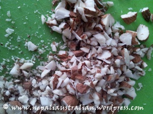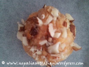 • Roll the ball in crushed almonds so the ball is fully covered with almond pieces.