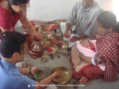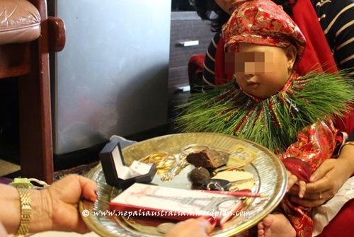 The place where the ceremony is to be held is cleaned and all the required ritual puja plate and food are arranged. Then the elder lady of the family will start the puja with the help of the priest. The first step is to put tika on the forehead of the baby, then the baby is given a special outfit, usually made of red velvet and embroidered with silver and golden threads. Gold and silver ornaments are also given to the baby, like heavy silver anklets (kalli) carved with dragon at both the ends to keep the bad omens away from the baby as well as gold bracelet.