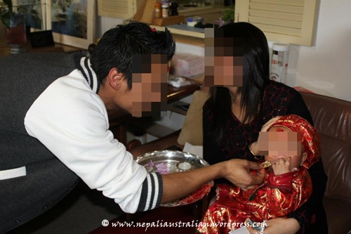 Once it is handed over, the baby is dressed in this special outfit and the ornaments and further ritual starts. First the baby is given dubo ko mala (a garland of holy grass). Then it is followed by puja and symbolic feeding of kheer (rice pudding) or the first bite of solid food. The baby is then offered all kinds of foods to taste from Thaa bu (a plate which has eggs, yogurt, wine, fruits, Roti, meat, fish) .