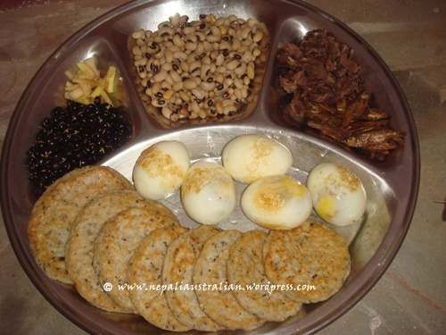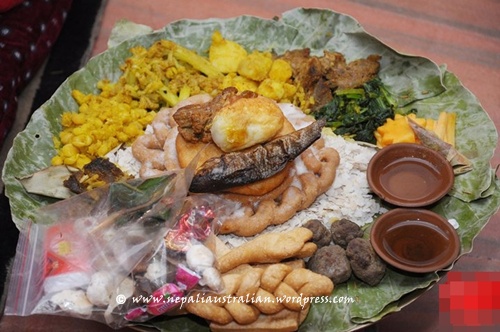 There are lots of food and gifts given to the child from his/her mother’s family. It will also include Sagun. Sagun typically consists of a boiled egg, smoked fish, a bara (pan-fried black lentil patties), haku chhoila (smoked buffalo meat) and aila (wine) and ends with dhau (yogurt). Also all the family and relatives bless the baby with gifts or money. It’s a beautiful and elaborate ritual.