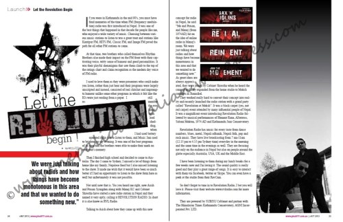 Revolution Radio has music for every taste from dance numbers, blues, metal, Nepali adhunik, Nepali folk, pop and rock music. They have live broadcasting from 7 am-11 am (12.15 pm to 4.15 pm Sydney time) everyday in the morning and the same time in the evenings as well. They are focusing not only on the audience in Nepal but also on people around the globe especially Australia,USA,UK and the Middle East.