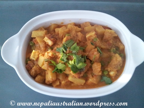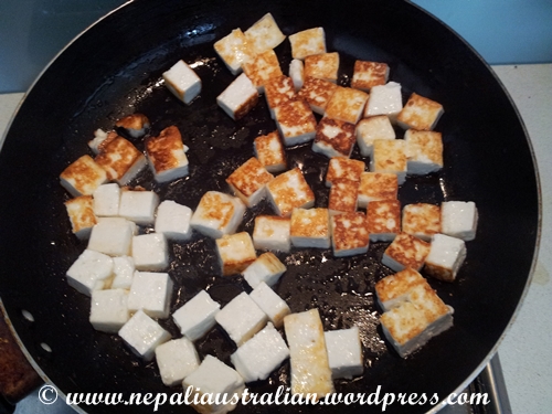 - Peel the potatoe and cut it into little chunks. You want them smaller than your paneer cubes.