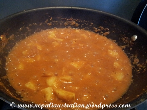 - Once the curry base is golden, add the potato chunks and the tomato paste. Pour in 300ml hot water and stir well.