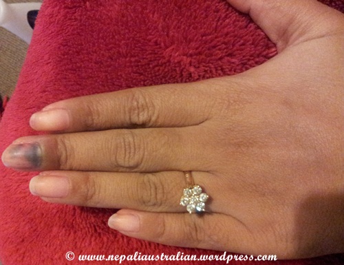 I so wished AS was home that day as I couldn’t control the pain and started crying. I just sat on the floor and did nothing for a while. When I gain my composure finally I went to the kitchen and ran cold water on my finger. I hoped running cold water for a while would make sure that my nail wouldn’t come off as it was turning a bit by then. It was one of the coldest days of winter and my hand felt almost dead after the ordeal. Thankfully, there was no blood but my nail turned black. It is still black and I am hoping it will not fall off as it doesn’t hurt any more. But for the first few weeks it was hard for me to pick anything up with that hand.