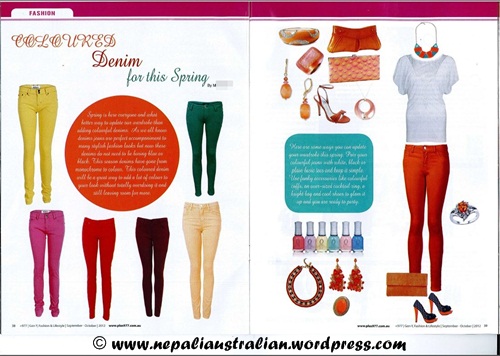 Here is some ways you can update your wardrobe this spring. Pair your colourful jeans with white, black or plain basic tees and keep it simple. Use funky accessories like colourful cuffs, an over-sized cocktail ring, a bright bag and cool shoes to glam it up and you are ready to party.
