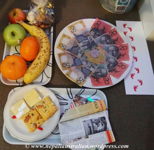 Then I performed Puja using tika, flower, garland, fruits, roti and masala.