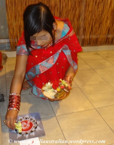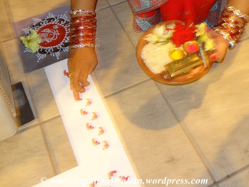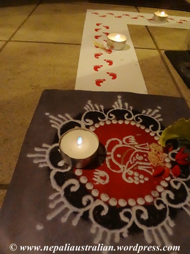 In Australia, we can’t do all this so I printed out small footsteps on paper and used that as an alternative to lead the Goddess Laxmi to our Puja area. Also at the start of the footsteps, I had a mandap of Lord Ganesh.
