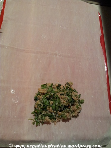 - Lay out a sheet of filo pastry, add ¼ of the mixture and shape into the size of a packet of playing cards at the centre of the bottom of the sheet, then push your thumb into the centre of the filling to make a space for it to expand as it cooks.