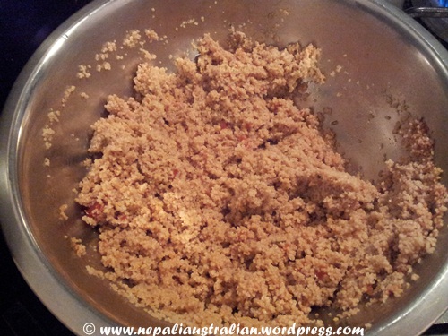 Add the caraway seeds to the side of the pan and toast for a minute, then scrape into a salad bowl.- Put ½ a mug of couscous (I used wholemeal one ) , 1 mug of boiling water, the tomato purée and a pinch of salt into a bowl and cover.