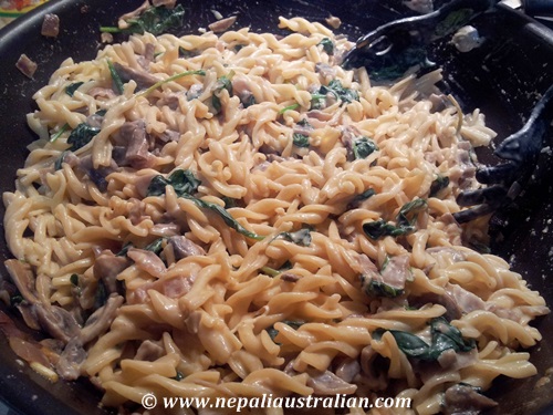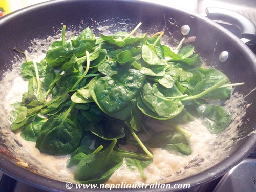 - Add cream and stir constantly, ensuring cream does not burn. Turn down the heat and add baby spinach until wilted.