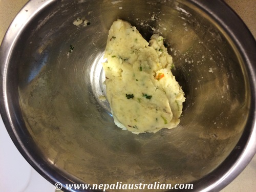 - Add green chilies, chopped fresh coriander, cumin seeds, cumin powder, coriander powder and salt to the mashed potatoes. Mix well like the way you knead dough.
