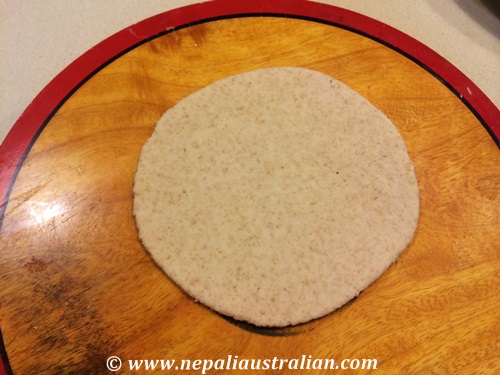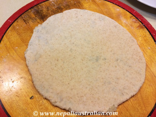 - Take a dough ball and roll using a rolling pin it to make a circle of around 3 inch wide. Use dry flour under the dough while rolling if the dough starts sticking to the rolling pan.