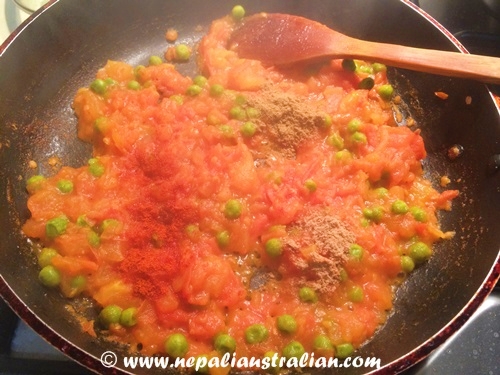 - Add turmeric powder and peas and stir it for a minute or so.