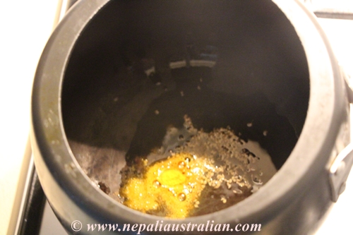 • Heat the pressure cooker on medium heat and add ghee. Let it get hot and add turmeric powder.
