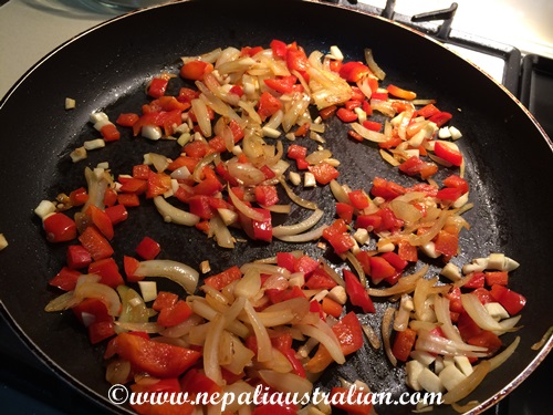 - In a medium frying pan, sauté onion and red peppers in ghee or macadamia oil on medium heat for 15 minutes. After 10 minutes of cooking, add fresh thyme, garlic, balsamic vinegar and a pinch of salt.