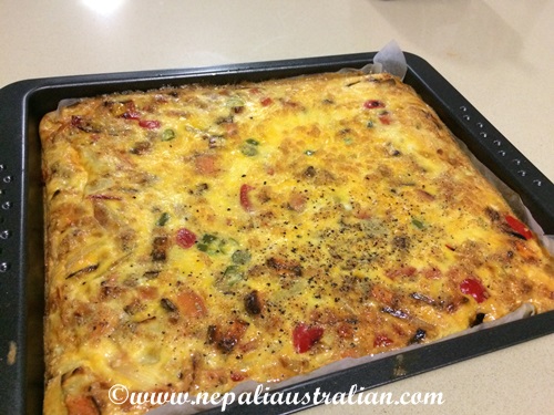 - Grease the bottom of a deep baking tray with coconut oil and line with baking paper, making sure the sides are covered. Assemble sweet potatoes and onion and red peppers mix evenly on the bottom. Pour whisked egg mix on top.