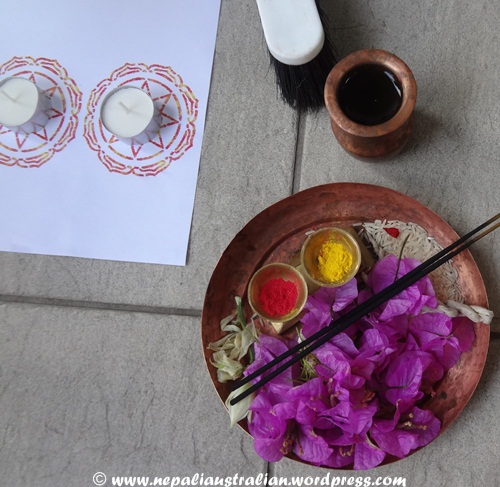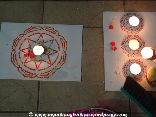 Before the Bhai Tika, just like in Maha Puja, the floor was purified by sprinkling water on it, and then we made Mandaps in front of a row of seats on the floor where my brothers were sitting. I used a copy of the same Mandap which was designed by AS but this time I printed them on A3 paper.