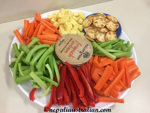 It had celery, carrot and capsicum with some cheese and biscuits. Perfect for someone who is trying to watch what they eat. I am definitely going to make sure we have this platter along with fruit platters on every morning tea we organise so I can eat without feeling guilty.