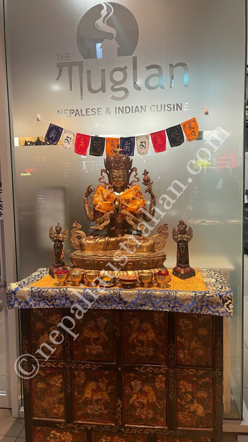 We arrived at the venue around 12, and there weren’t many people. I loved the decor. As my eyes moved towards the Dhaka wallpaper, I noticed many more Nepali decorations like the statue of Goddess Tara and traditional Thangka paintings.