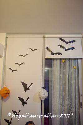 Everyone was so impressed with what he had done with the decoration. We had our window in the living room decorated with Halloween silhouettes. He spent lots of time making this. We also had a big cloth painting of the Grim Reaper with red eyes and a scary voice.