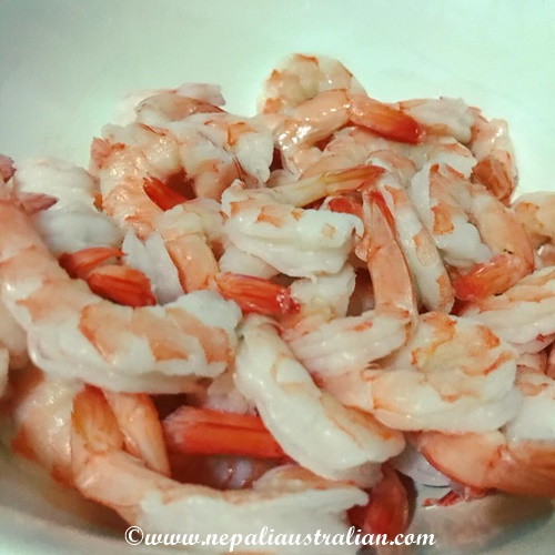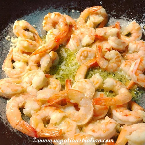 • Add prawns and cook over high heat for about 4-5 minutes or until prawns are cooked. Add pepper before serving.