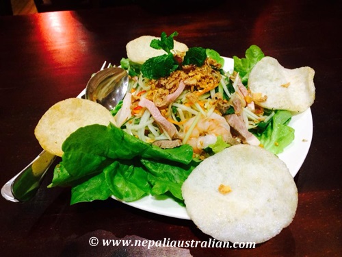 Finally, we decided on a Vietnamese restaurant. AS ordered three-way pork dish, which was really yummy and I ordered my favourite papaya salad with prawn and pork. The portion size was just perfect for us.