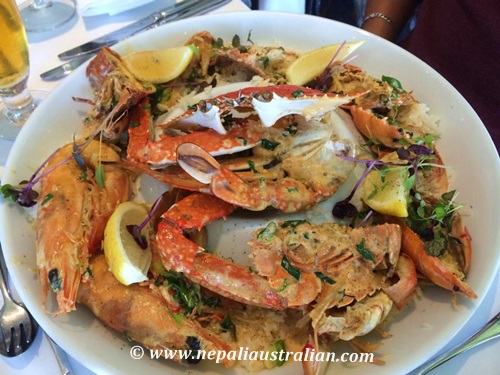 So we had Lobster mornay, Moreton Bay bugs, BBQ king prawns, Kilpatrick & mornay oysters, scallops in the shell, BBQ octopus, salt & pepper calamari, barramundi pieces, tempura prawns, blue swimmer crab, natural oysters, fresh prawns & smoked salmon which were just delicious.